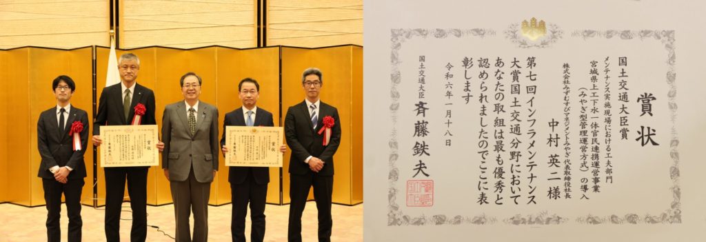 株式会社みずむすびマネジメントみやぎ、および株式会社みずむすびサービスみやぎは、国土交通省をはじめとする各省庁が主催する「第7回インフラメンテナンス大賞」において、宮城県企業局と連名で「国土交通大臣賞(メンテナンス実施現場における工夫部門)」を受賞しました。