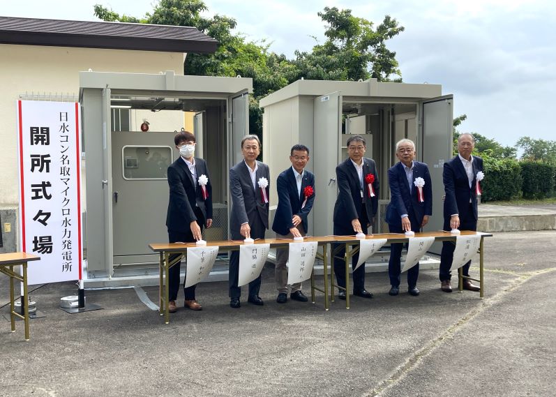 2024年8月23日に宮城県名取市岩沢配水池敷地内において、「日水コン名取マイクロ水力発電所」開所式が行われました。この事業は、株式会社みずむすびマネジメントみやぎ(以降、当社)が運営権者を担う宮城県上工下水一体官民連携運営事業において初めて実施する任意事業です。式典には、来賓として山田 司郎 名取市長、千葉 隆浩 宮城県仙南‧仙塩広域水道事務所長をお招きし、本任意事業の発電事業者であり当社の株主の1社である株式会社日水コンの間山一典社長、そして当社代表取締役社長 門脇 進などが出席しました。